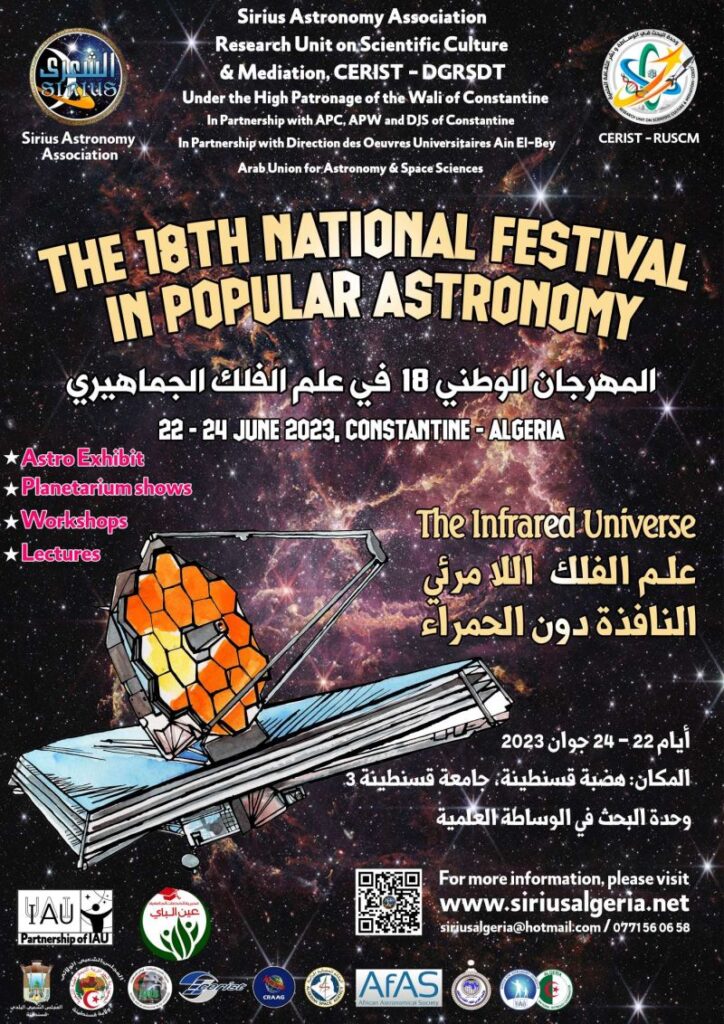 The Sirius Astronomy Association, Scientific and Technical Information Research Center (Centre de Recherche sur l’Information Scientifique et Technique), Algeria, and the Directorate-General for Scientific Research and Technological Development (DGRSDT) are hosting the 18th Edition of the National Festival in Popular Astronomy, titled ‘The InfraRed Universe,’ is scheduled to take place from June 22 – 24, 2023. The festival will be held in collaboration with esteemed organisations, including the African Astronomical Society (AfAS), International Astronomical Union (IAU), Arab Union for Astronomy & Space Sciences (AUASS), and the CRAAG Research Center, Algiers.