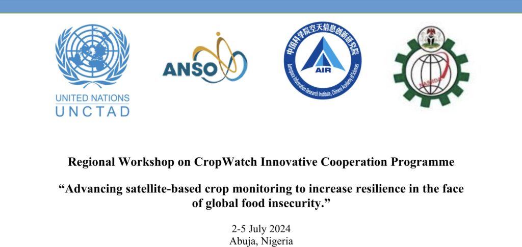 The workshop, “Advancing satellite-based crop monitoring to increase resilience in the face of global food insecurity,” will be held between 2 and 5 July 2024 to demonstrate the progress and effectiveness of the customised CropWatch system in Nigeria. Participants will be granted access to the technology during and after the workshop and receive training on utilising and customising it for specific local requirements. The workshop will be hosted by Nigeria’s National Space Research and Development Agency (NASRDA) in collaboration with UNCTAD, ANSO, and AIR-CAS.