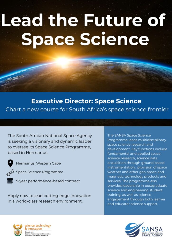 The South African National Space Agency (SANSA) invites applications for the Executive Director position of its Space Science Division, based in Hermanus, South Africa. This position offers an exceptional opportunity to lead and manage the agency’s Space Science Programme while contributing to its strategic vision and long-term sustainability.