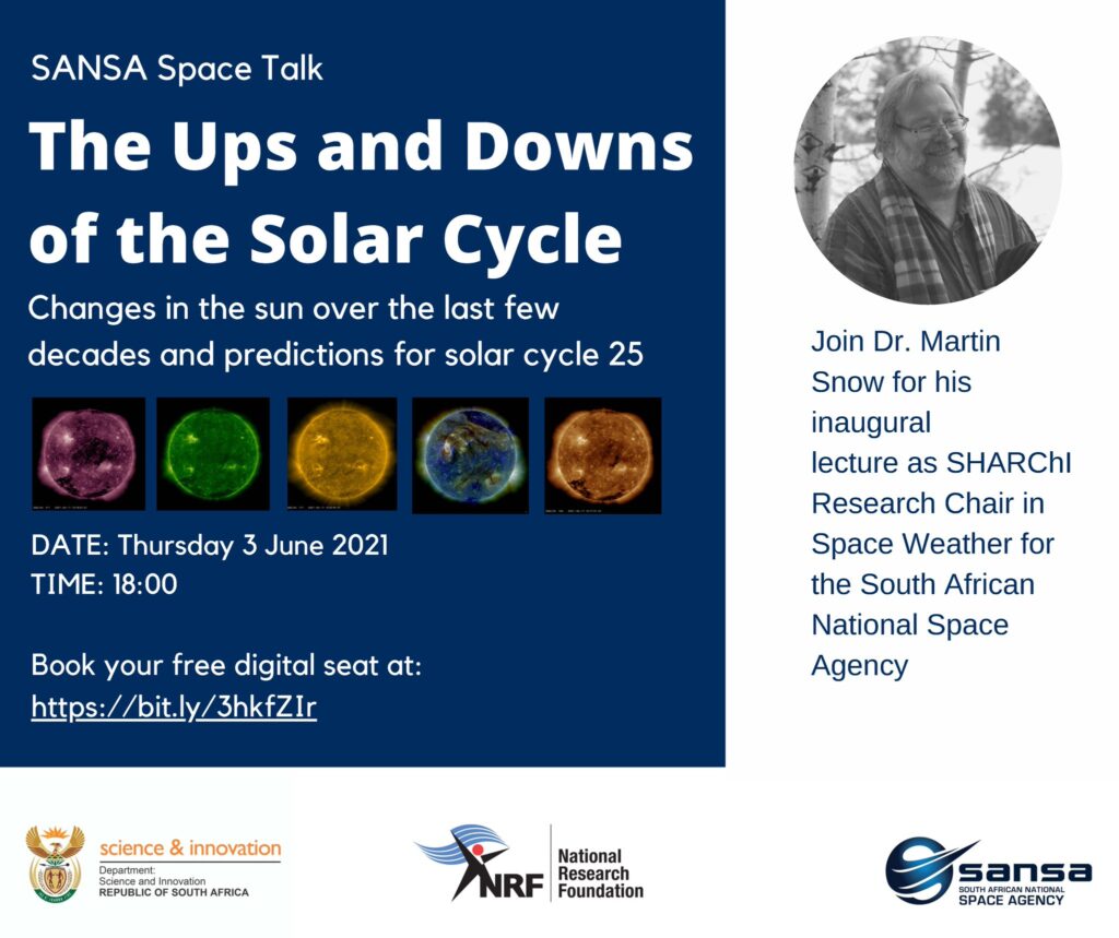 The topic for the event is: The Ups and Downs of the Solar Cycle. Furthermore, the space talk will also double as the inaugural lecture of Dr Martin Snow. He will discuss the changes in the Sun over the last few decades and predictions for solar cycle 25. Recall that Dr Martin Snow was appointed as the First research chair of SANSA Research Chair Initiative (SARCHI) in April 2021.